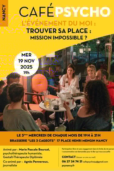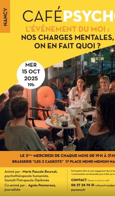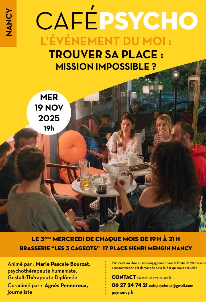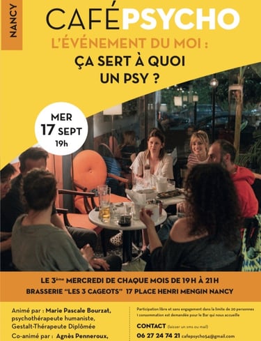 j'ai donc décidé de démarrer et animer un café psycho à Nancy où il n'y en avait jamais eu. La première rencontre a eu lieu en septembre 2025. Une fois par mois, j'anime, avec Agnès Penneroux, journaliste, cet espace à la Brasserie des 3 cageots qui veut bien nous accueillir.