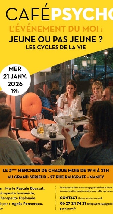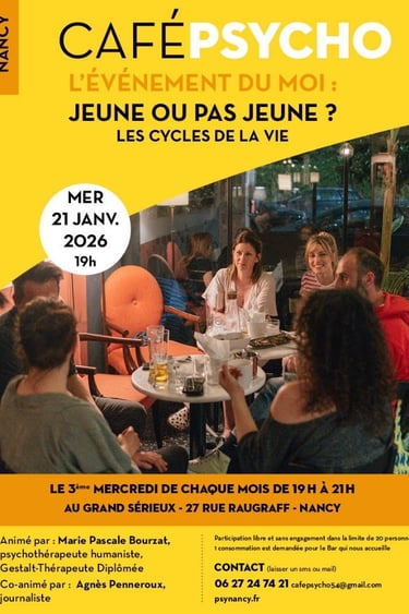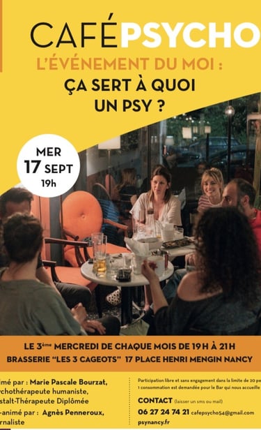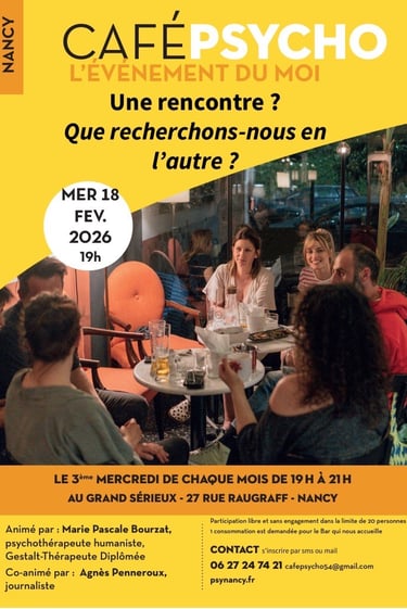 J'ai donc décidé de démarrer et d'animer un café psycho à Nancy où il n'y en avait jamais eu. La première rencontre a eu lieu en septembre 2025. Une fois par mois, je co-anime, avec Agnès Penneroux, journaliste, cet espace au "Grand Sérieux", bar/restaurant, qui veut bien nous accueillir.